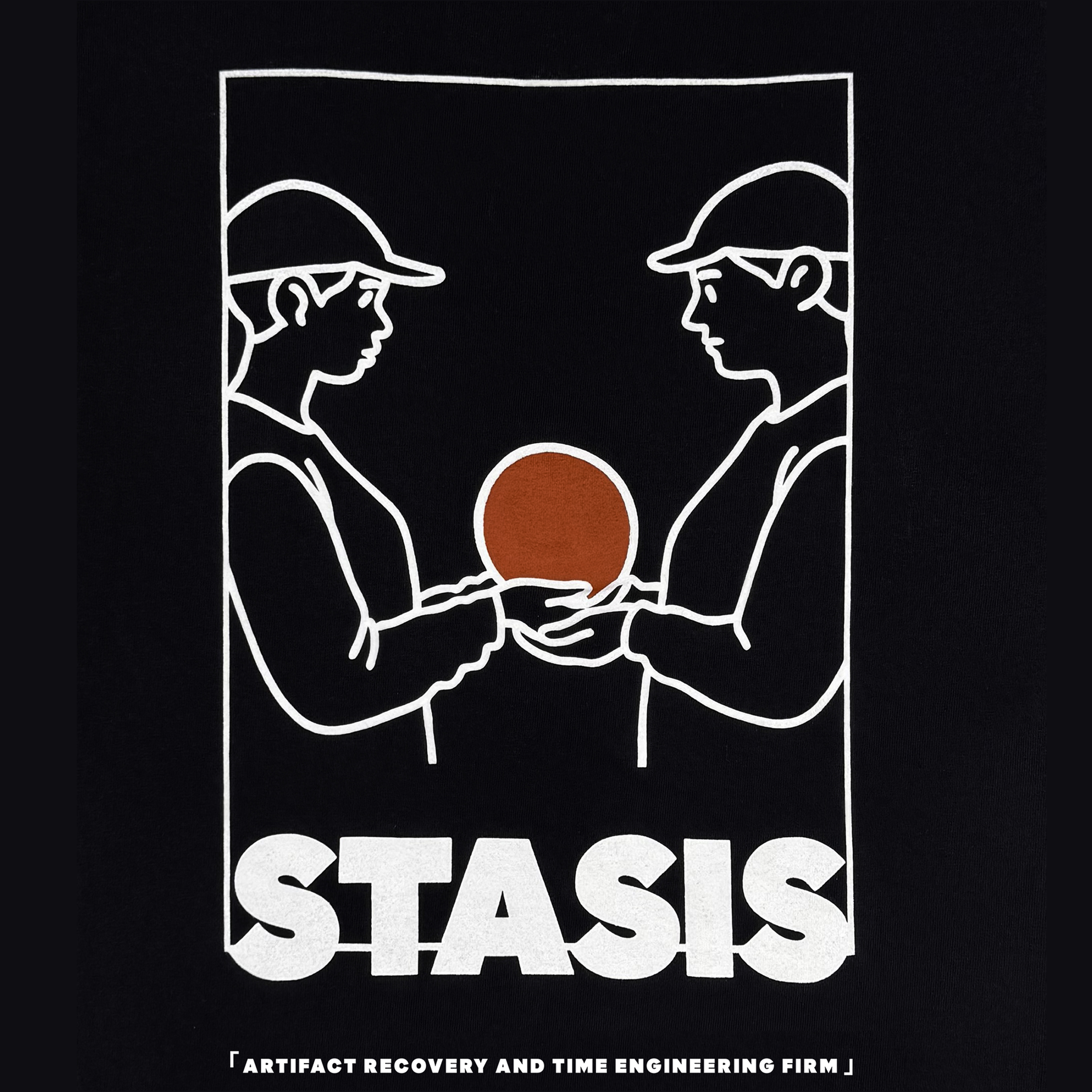 The SF-1 [CORE] Orbital Team Shirt is the commemorative of the first time travel made by the STASIS team. The depiction shows two STASIS team members holding up the Orbital.1 device.
